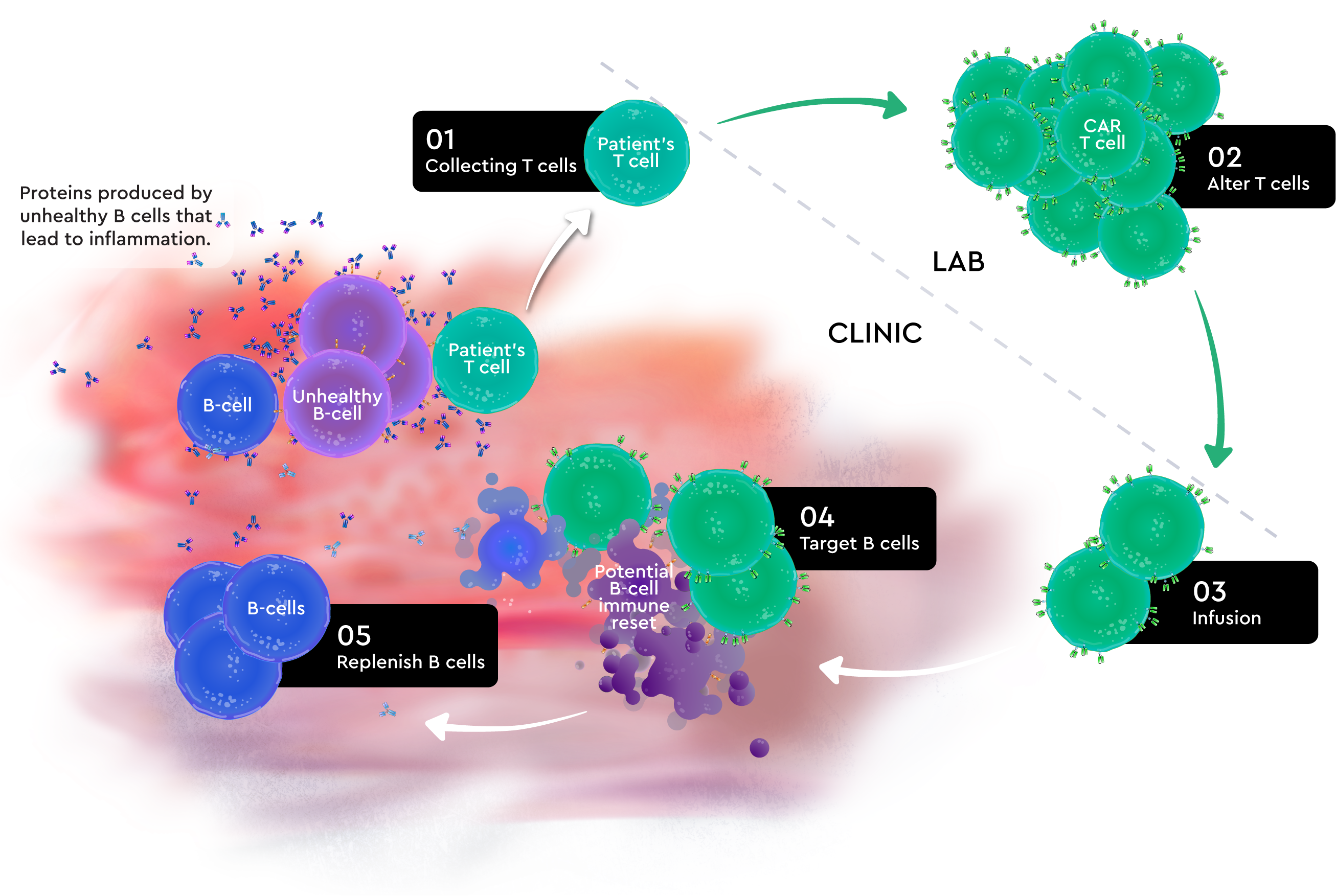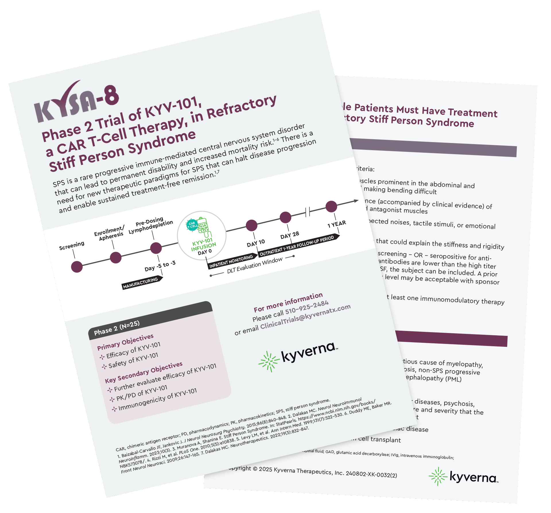 Contact UsKYV-101 is an investigational CAR T-cell therapy used in over 50 patients. KYV-101 works with your immune system to target the cells that harm your body, including unhealthy B cells that may contribute to disease activity in SPS.